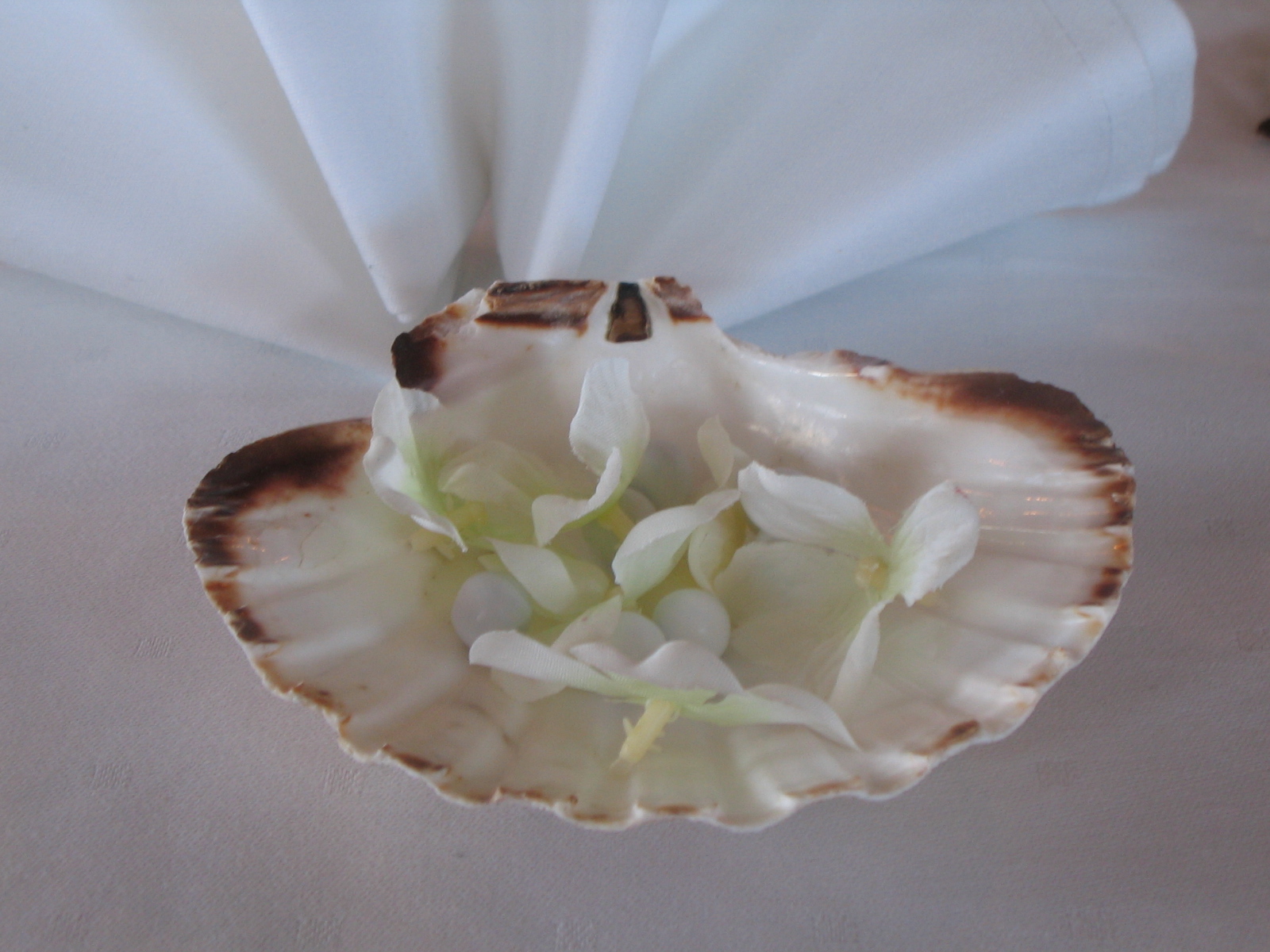 Tyhjiä kotiloita kertyy isot kasat kalakauppiaan tiskin alle myyntipäivän aikana, enkä tiedä, minne ne sieltä joutuvat. Vuosia sitten pyysin kuitenkin saada niitä 100 kpl tyttäreni häihin. Valitsin vaaleimmat ja kauneimmat, putsasin ja pesin ne hyvin. Jokaisen häävieraan paikalla oli pöydällä koristeena tällainen simpukka silkkikukkineen ja helmineen. Helmet olivat tosin vain Marianne-karamellien pyöreitä rae-versioita.