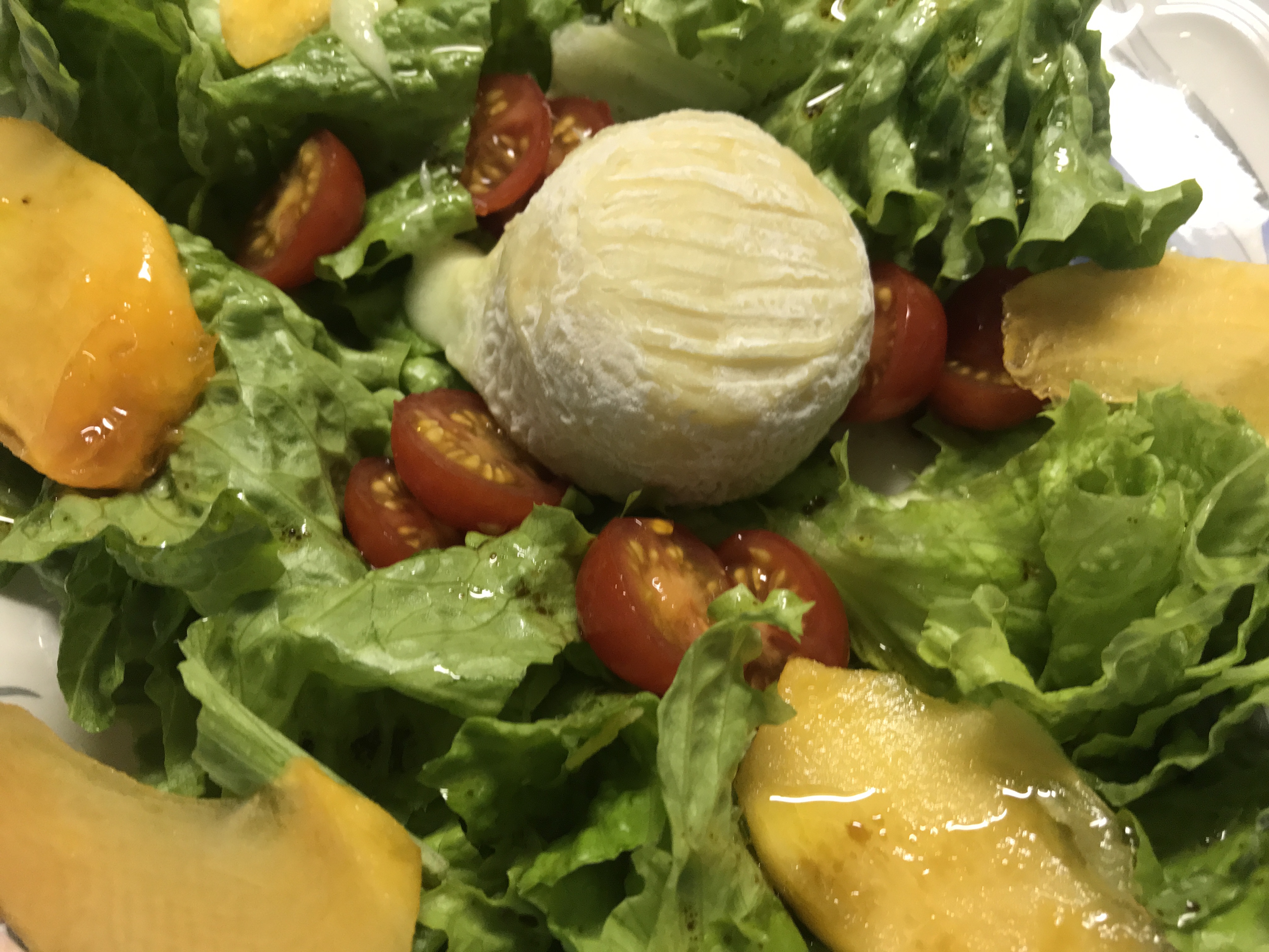 Suomessa olen ravintolassa tainnut nauttia vuohenjuustosalaattia vain jo lakkautetussa Fleuriste -kahvilassa, mistä nappasin idean tarjoilla lämmin vuohenjuusto välillä kokonaisena salaatin keskellä. (Kuva alla)