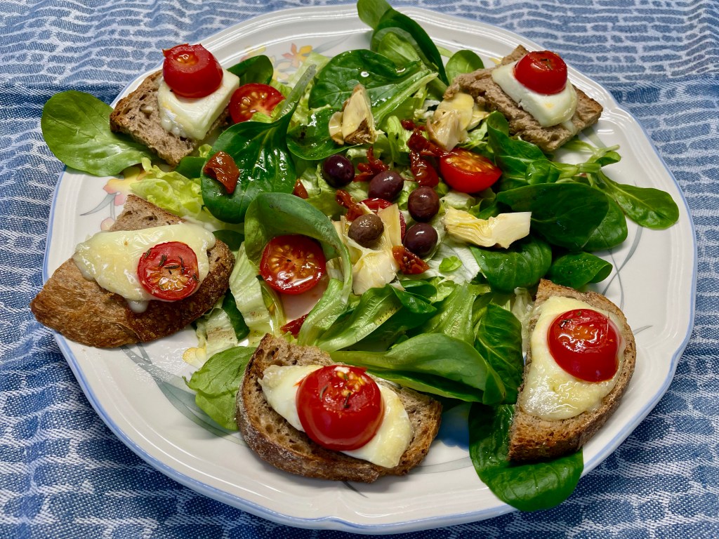 Vuohenjuustosalaattia nautimme melkein kerran viikossa joko bistrojen klassisena versiona tai vähän mukaellen valmistettuna. Se löytyy tosiaan varmaan jokaisen bistron ruokalistalta, ja on lämpimän juuston vuoksi myös hyvä talvisalaatti. Perusversiossa on erilaisia salaatinlehtiä, tomaattia ja maalaisleivän päälle viipaloitua vuohenjuustoa, usein myös pekonia ja pinjansiememiä. Minä jätän pekonin pois, mutta vaihtelen muuten lisukkeita ja korvaan pinjansiemenet saksan- tai pecan-pähkinöillä. Talvella, kun tomaatit ovat usein mauttomia tai jopa happamia, voi tomaatin sijaan salaattiin panna päärynäviipaleita.