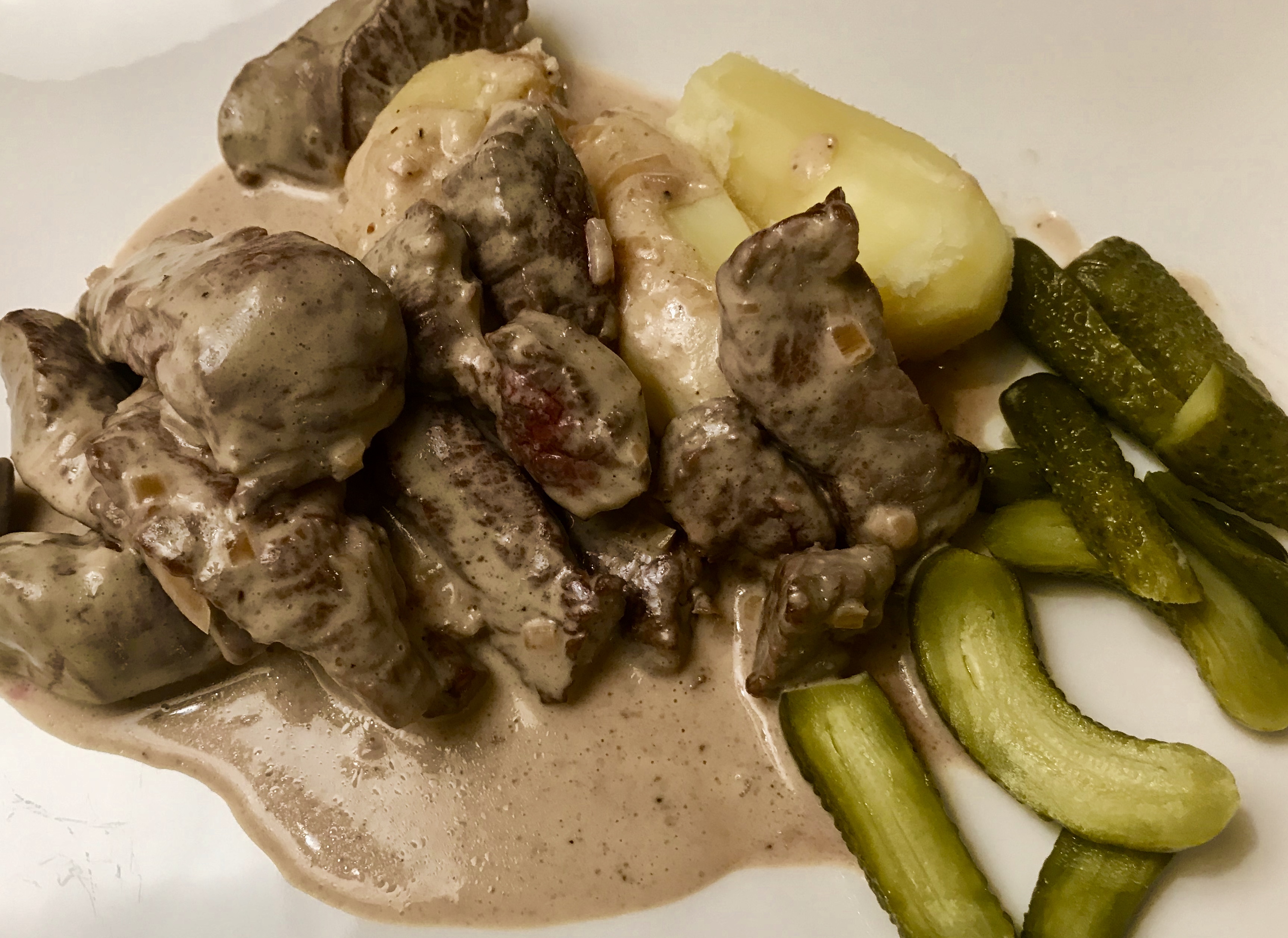 Tarjoile stroganov perunoiden ja suolakurkkujen kanssa.