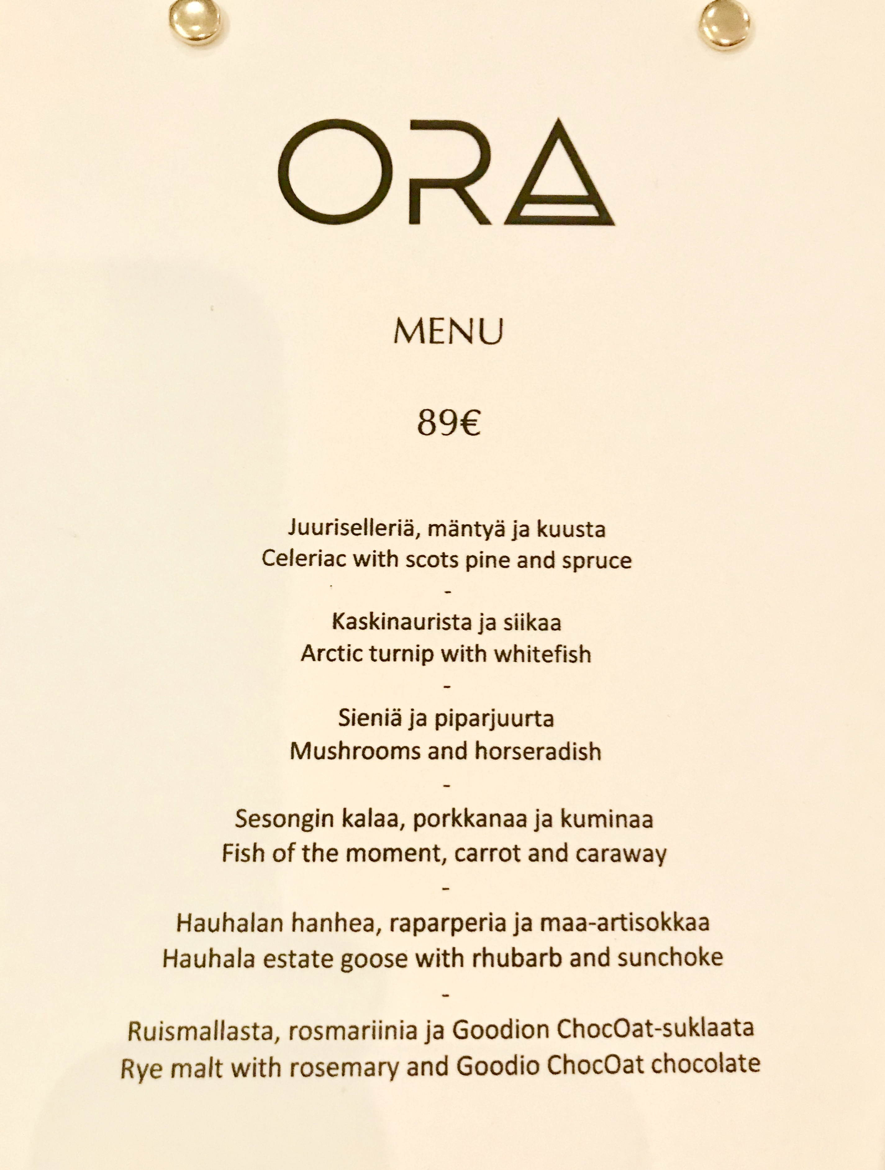 Tyttären tyttäreni käytti pienenä suosikkiruoastaan ilmaisua: ”Tää on mun parasta”. Helsingissä ”mun parasta” tarjoaa ehdottomasti ravintola ORA. ORAn fine dining -kokemuksesta on vaikea kertoa niin, ettei se joka tapauksessa olisi vain vaisu kuvaus koetusta. Menun näkeminenkin antaa vain haljun aavistuksen tulossa olevasta nautinnosta.