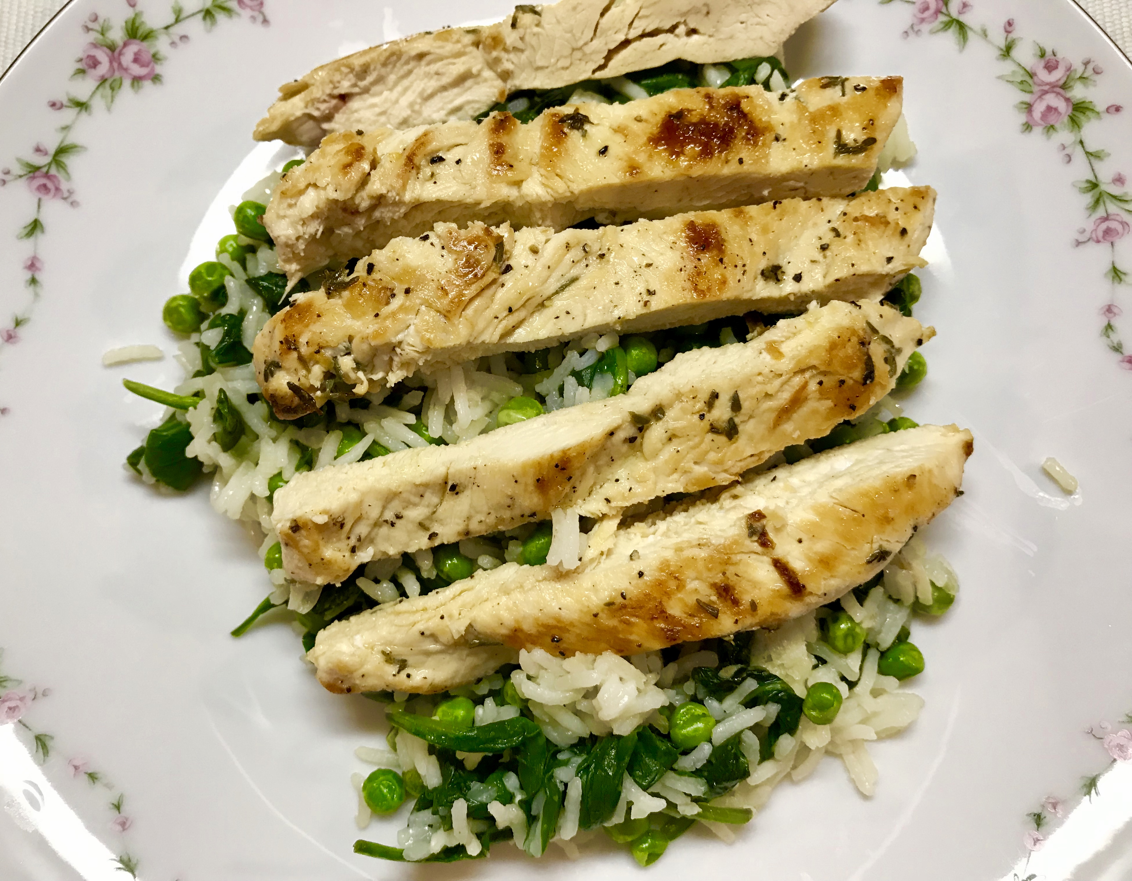 Huuhtele baby-pinaatit ja lisää ne ja pakastetut herneet kypsän riisin sekaan. Jos kana ei tuoksu tarpeeksi timjamille, voit lisätä vielä riisiinkin tuoretta timjamia. Kuumenna ja hämmentele noin kahden minuutin ajan niin, että pinaatinlehdet ja herneet kuumenevat.