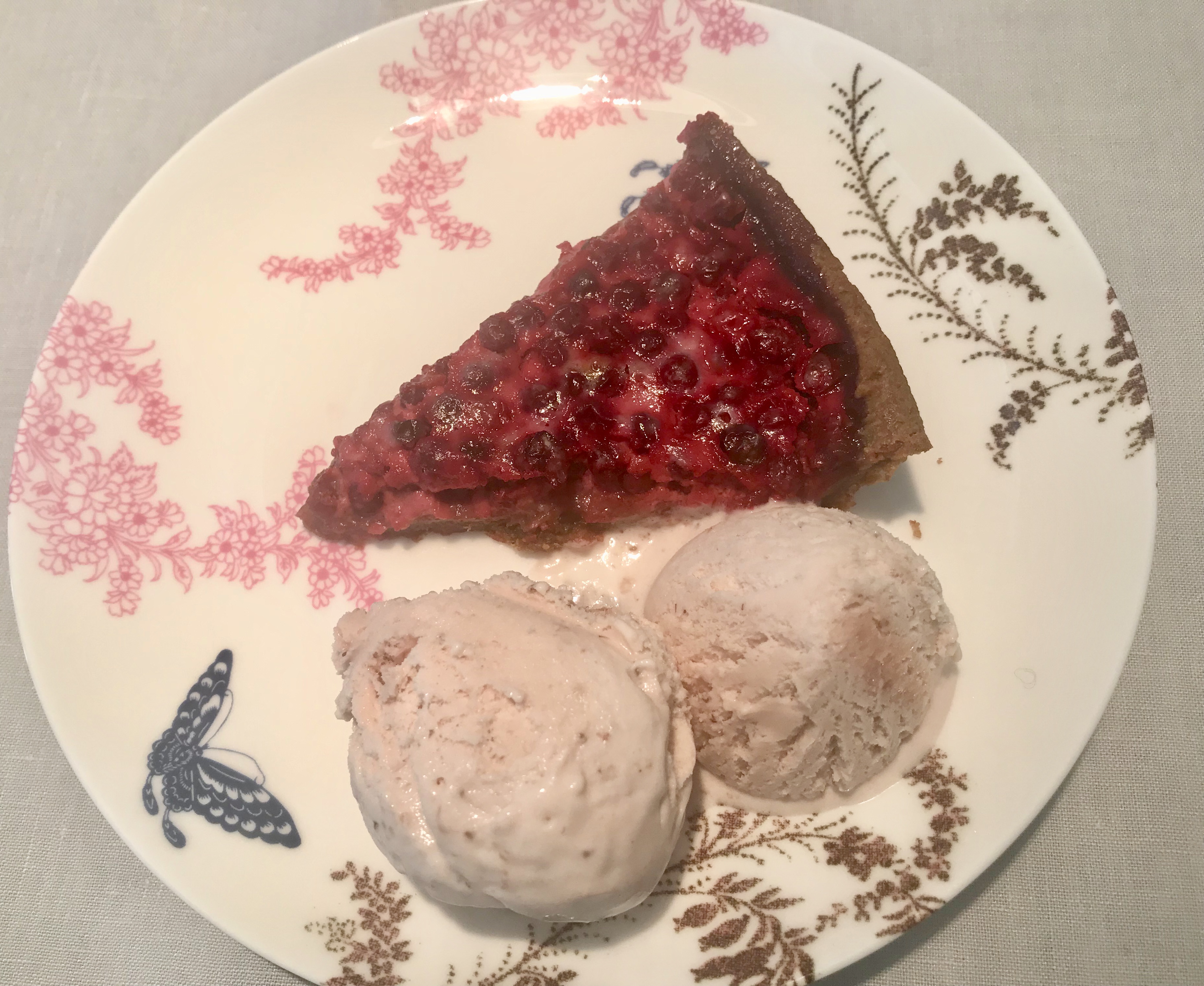 Tämä piirakka on tehty noudattaen ohjetta, jota jo kaikkien äidit ja isoäidit käyttivät mustikkapiirakkaan – paitsi että piirakka on tehty valmiiseen ruis-kaurataikinaan ja mustikoiden sijasta on käytetty puolukoita. Jos pitää pakastimessa aina valmiina pyöreitä ruis-kaurapiirakkapohjia (esim. Myllyn Paras) ja puolukoita sekä jääkaapissa kananmunia ja kermaviiliä, voi tämän piirakan vääntää mihin tahansa makeannälkään tai yllätysvieraille. Sokeria olisi vielä hyvä löytyä vähän kaapista. Jäätelö ei ole olleenkaan välttämätön, mutta sopii erittäin hyvin tämän hieman happaman marjapiirakan kanssa. Häagen Dazs -mansikkajäätelö on ylivoimainen seuralainen mutta en löytänyt sitä, ja ostin Pirkka Mansikka & Raparperi -jäätelöä, joka oli aika vaisua verrattuna edelliseen. Tarjosin vaihtoehtona myös LOHILO-nimistä (Lo Carb, Hi Potein, Lo Fat) mansikkajääteloä, ja vaikka haluan yleensä herkut herkkuina eikä minään terveysversioina, ihastuin tähän jäätelöön piirakan lisukkeena. Siinä oli enemmän makua kuin Pirkan Mansikka & Raparperi -jäätelössä.