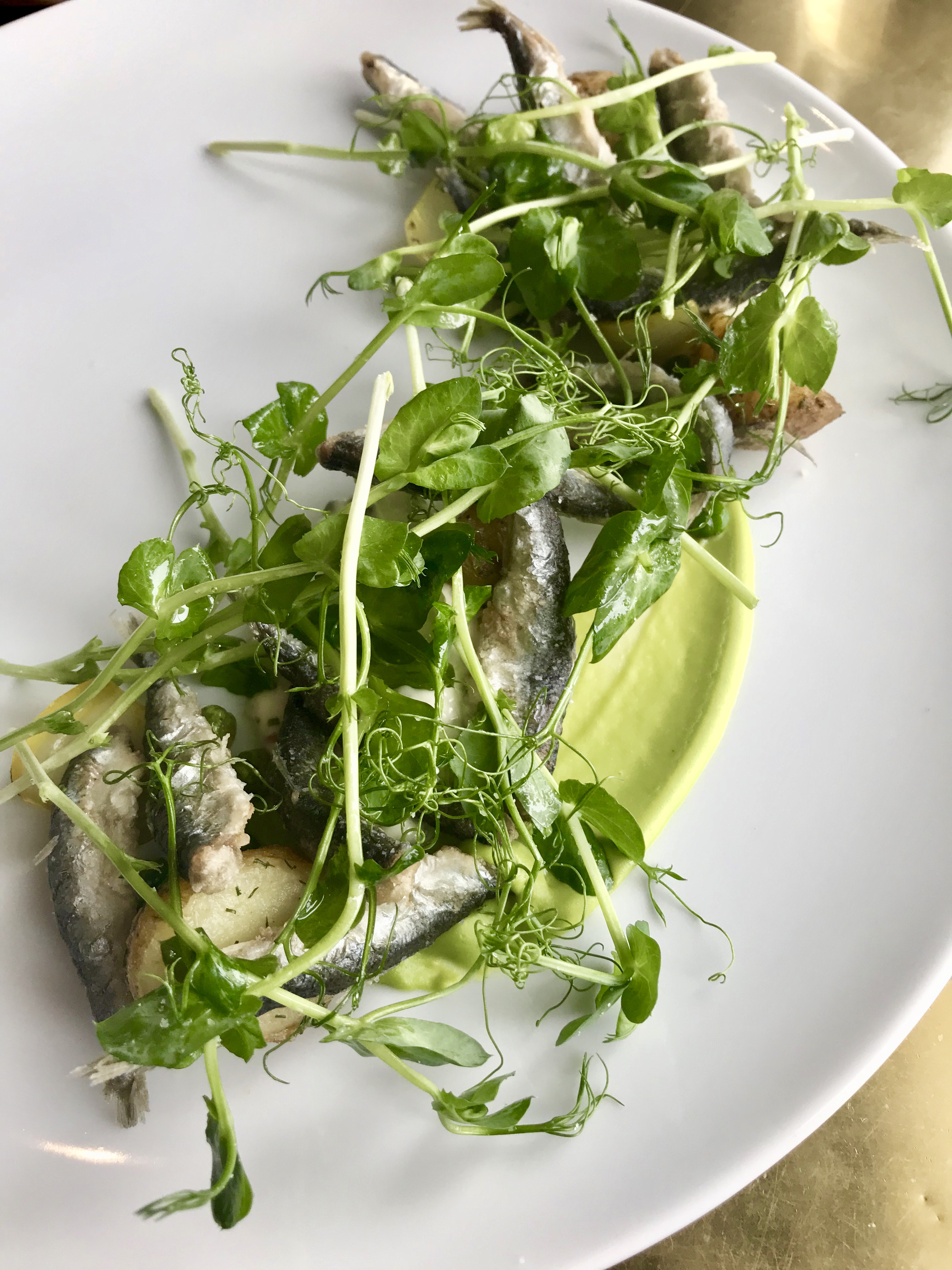 Tänään ainakin lounaalla he lunastivat lupauksensa. Alkuruokasalaatissa yhdisteltiin onnistuneesti Brie-juustoa, ohuen ohuita rapaperi-kiehkuroita ja paahdettua lehtikaalia. Valitsemani pääruoan rapeat muikut oli paneroitu ja paistettu todella kevyesti ja ne tarjoiltiin herneenversojen, tilliperunoiden, herne-pyreen sekä remoulade-kastikkeen kera. Tällaista annosta ei saa joka päivä.