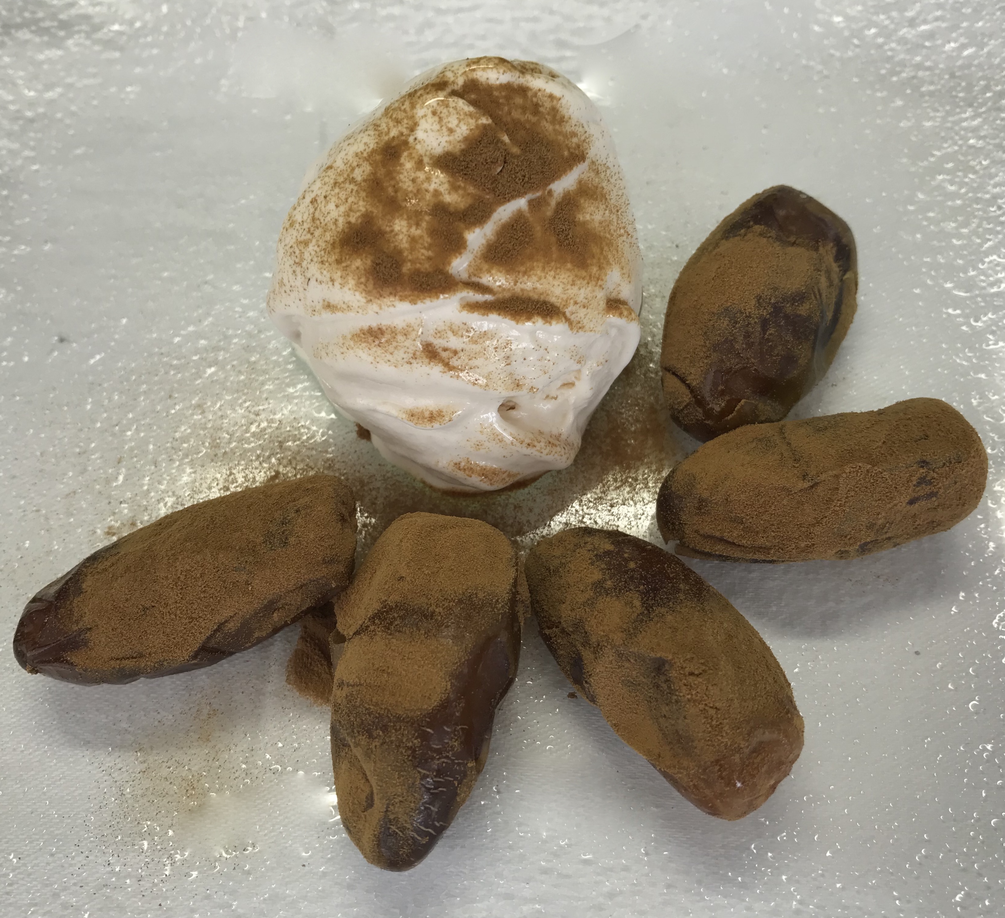 Mittaa lakritsijauhetta pieneen kippoon ja pyörittele taateleita jauheessa. Asettele taatelit tarjoilulautaselle ja lisää lautaselle jäätelöpallo. Jos sinulla on suorakaiteen mallinen jäätelöpaketti, leikkaa siitä poikittain noin kahden sentin paksuisia viipaleita, jotka vielä leikkaat noin kahden sentin paksuisiksi tangoiksi (näin poikani teki). Asettele kullekin lautaselle kolme tankoa ja sitten muutama lakritsijauheessa pyöritetty taateli. Ripottele vielä hiukan jauhetta jäätelön päälle – ei kuitenkaan paksulti, sillä hienoa jauhetta vetäisee helposti henkeen!