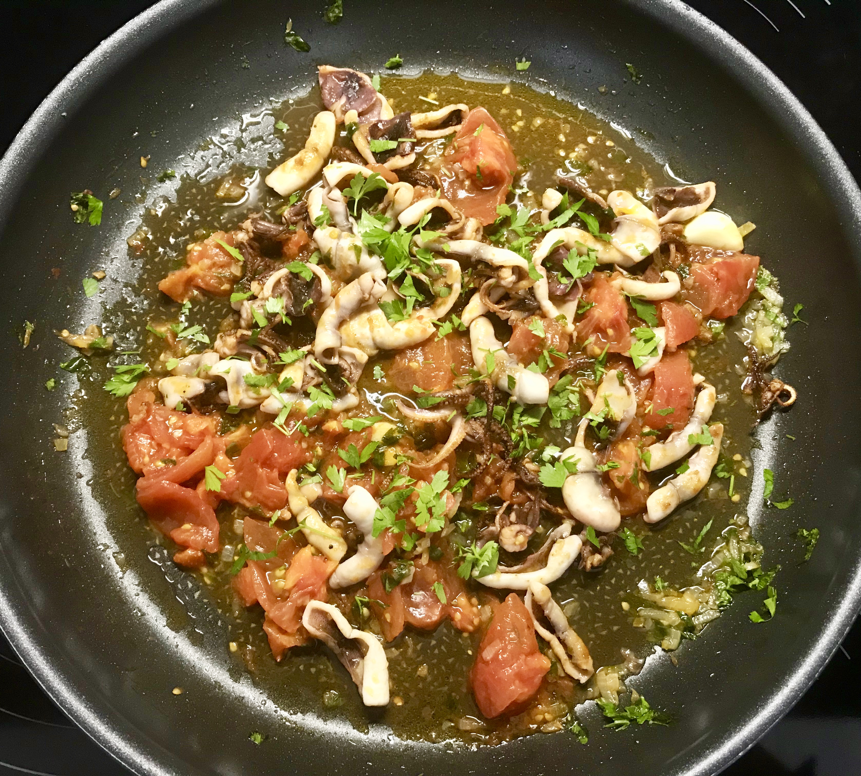 Paistamisen jälkeen mausta mustekaloja hiukkasen suolalla ja pippurilla ja lisää joukkoon viini ja anna mustekalojen kiehua jonkin aikaa, kunnes viini on lähes haihtunut. Lisää tomaattikastike joukkoon ja anna vielä kiehahtaa. Tarjolle tuotaessa ripottele vielä päälle persiljaa. Tarjoa riisin tai salaatin kera.