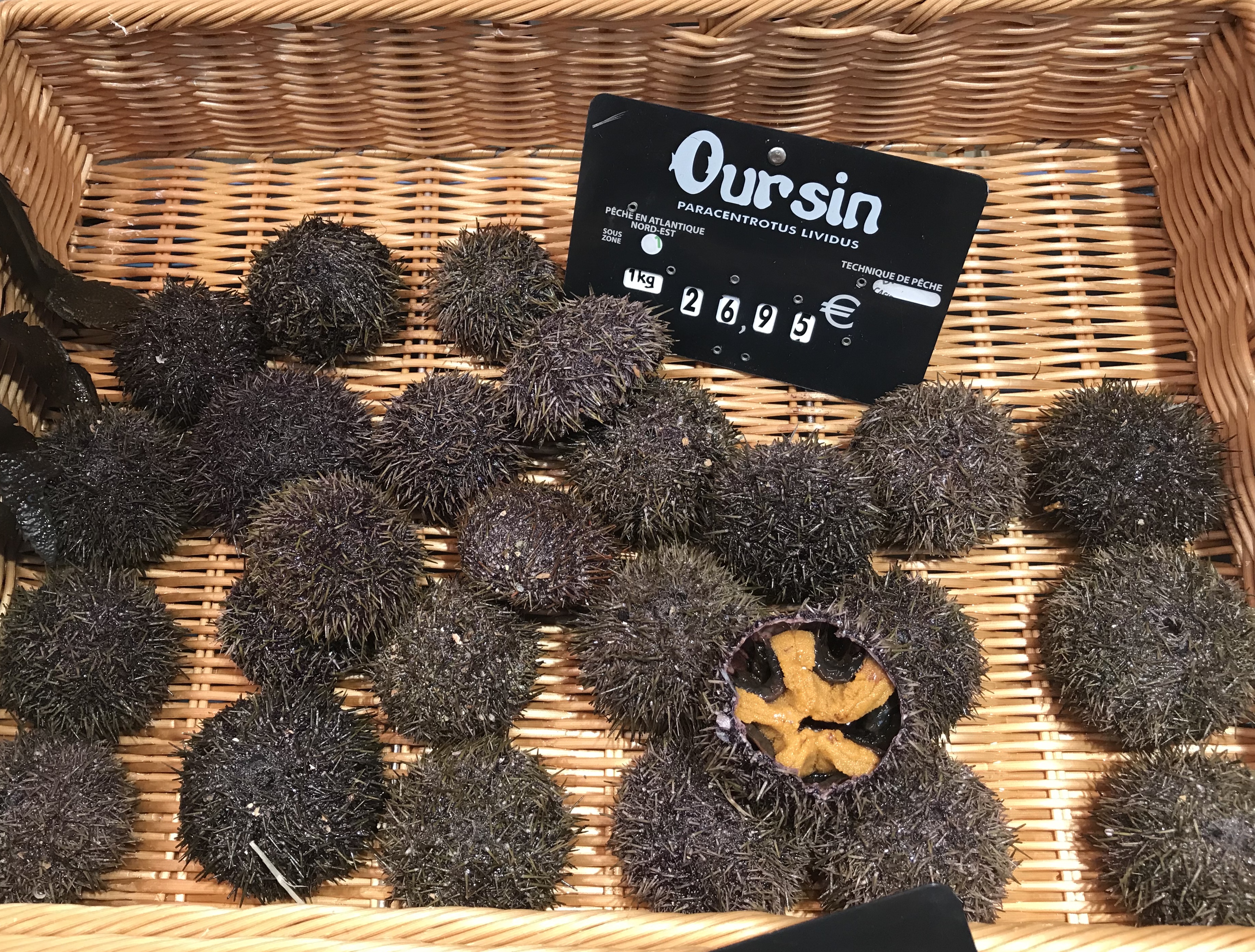 Kuvassa ylhäällä vasemmalla merisiiliä ja vieressä taskuravun saksia, joista en kumpiakaan ole itse käyttänyt ruoanlaittoon. Avattuja merisiiliä olen nähnyt suosikki sushiravintolani ”liukuhihnalla”. Kerran vieressä istuva isoisä noukki ”hihnalta” sellaisen maisteltavaksi lastenlastensa kanssa. Kaikki nyökyttelivät hyväksyvästi ja totesivat: ”Hyvää!”. Mieheni ja minä rohkaistuimme naapurien kokemuksesta, mutta emme saaneet sitä yhtä merisiiltä loppuun saakka syötyä. Merisiili nautitaan raakana, ja siitä syödään kuvassa näkyvät punaiset osat, eli ”corail”, joka on merisiilin mätiä.