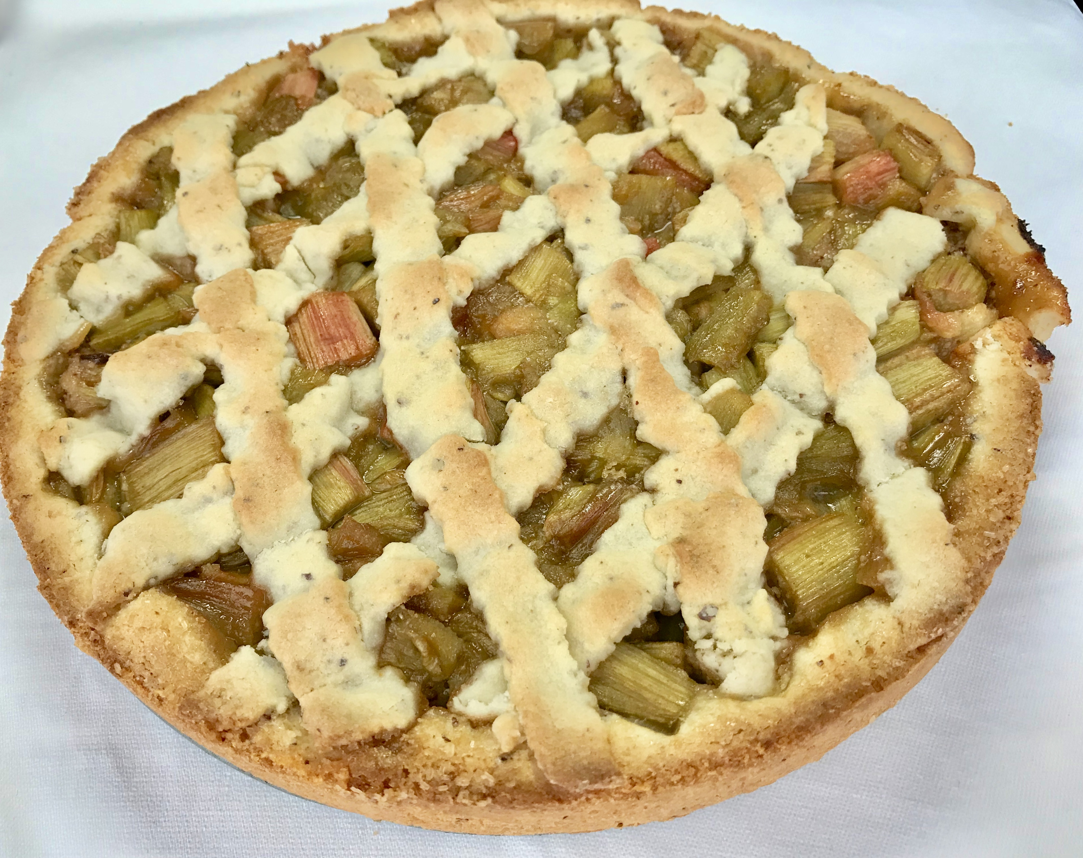 Kuumenna uuni 180°C:een. Ota taikina jääkaapista ja leikkaa siitä noin 100 – 130 g pala koristelua varten. Ohjeessa loppu taikina muotoillaan jauhon avulla pöydällä pyöreään muotoon, mutta minä muotoilen sen kelmun välissä käsin taputellen. Nosta taikina voideltuun vuokaan ja viimeistele muotoilu taputellen niin, että taikina nousee myös vuoan reunoille. Levitä loput jauhetut pähkinät taikinan päälle. Kaulitse jäljellä oleva taikina ja leikkaa siitä kaistaleita. Levitä raparperit tortun päälle, ja sirottele siihen vielä loput ruokosokerista. Koristele torttu taikinakaistaleilla ja paista torttua n. 45 minuuttia.