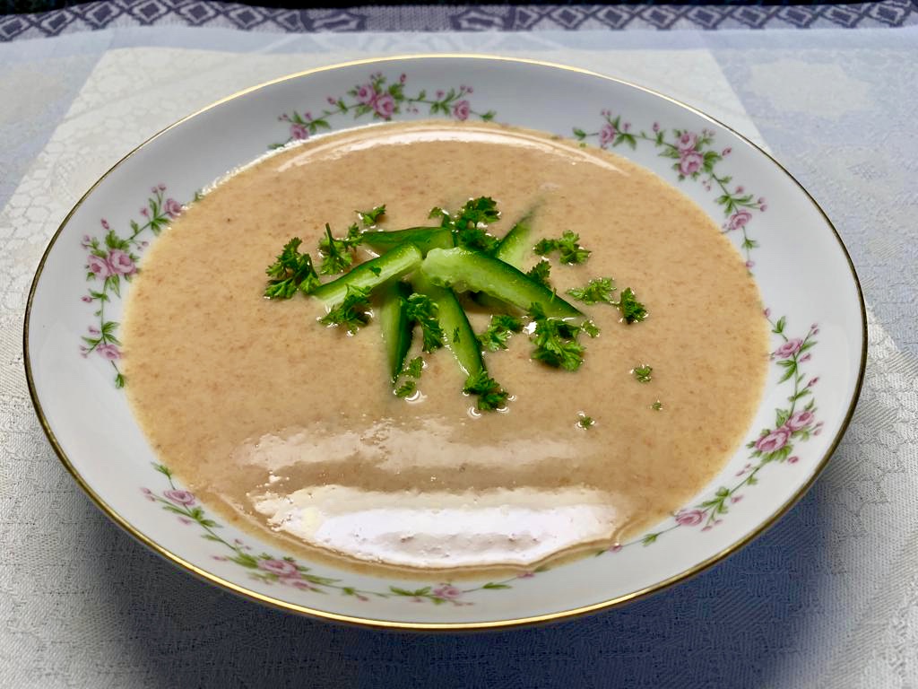 Hiero keitto siivilän läpi ja siirrä se takaisin kattilaan ja anna kiehahtaa. Nosta keitto pois liedeltä ja lisää kerma. Jäähdytä keitto (lasken altaaseen vettä ja lisään veden joukkoon pari kylmäkallea). Siirrä keitto jääkaappiin jäähtymään noin tunniksi. Tarjolle tuotaessa pane kurkkutikut lautasen pohjalle ja koristele keitto basilikalla. (Kuvassa on persiljaa, mutta kokeilin myös basilikaa, joka itse asiassa sopii keittoon täydellisesti!)