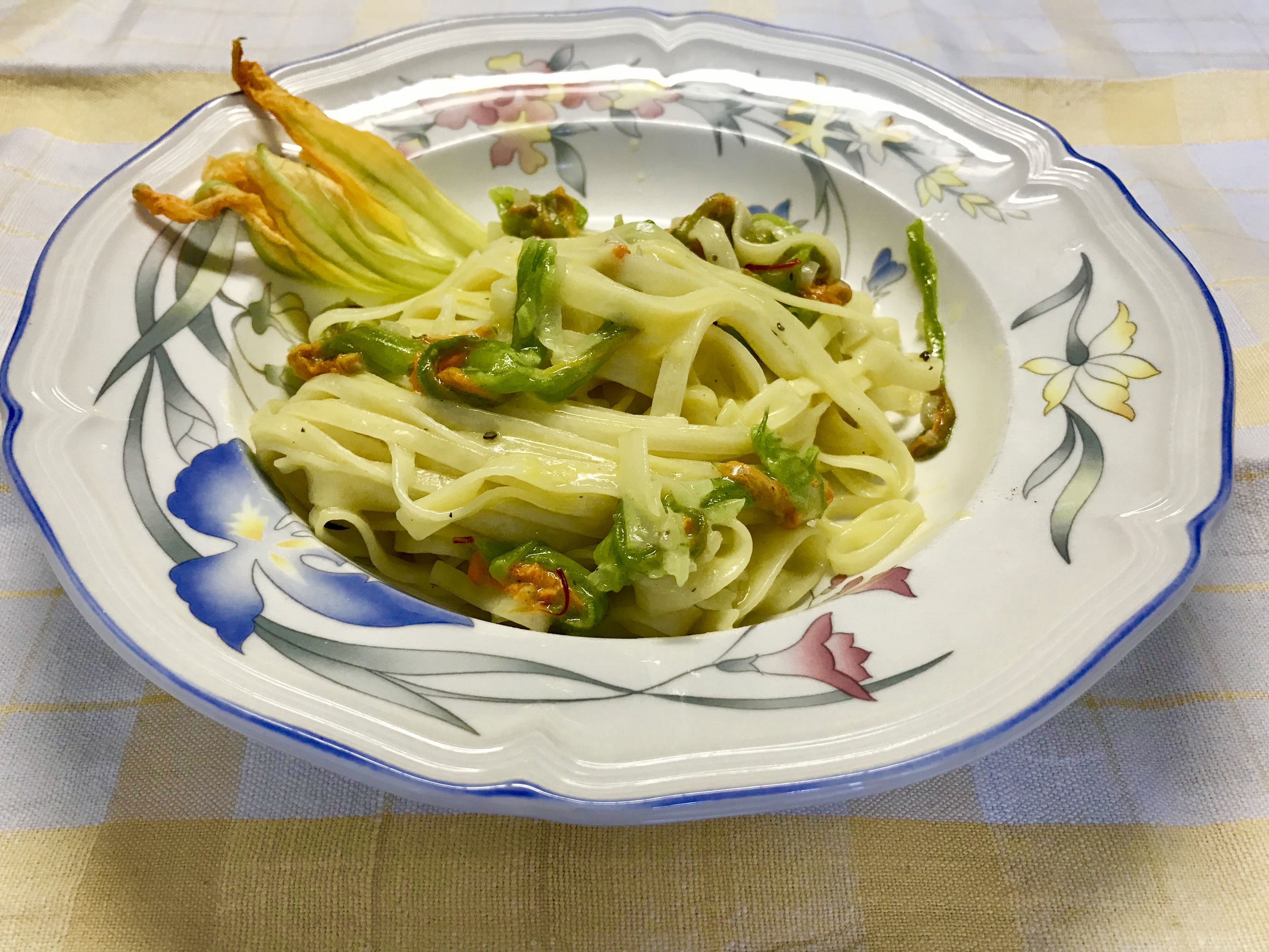 Italialaisesta Grazia-lehdestä löytämässäni ohjeessa valmistetaan 12 kukasta pasta neljälle. Minun mielestäni se on todella pieni määrä kukkia – jos kukkia olisi näin vähän, lisäisin ainakin ohuen ohuita, öljyssä paistettuja kesäkurpitsaviipaleita pastan joukkoon. Muutenkin käytin Grazia-lehden kastikkeen ainemäärät kahden hengen pastaan,