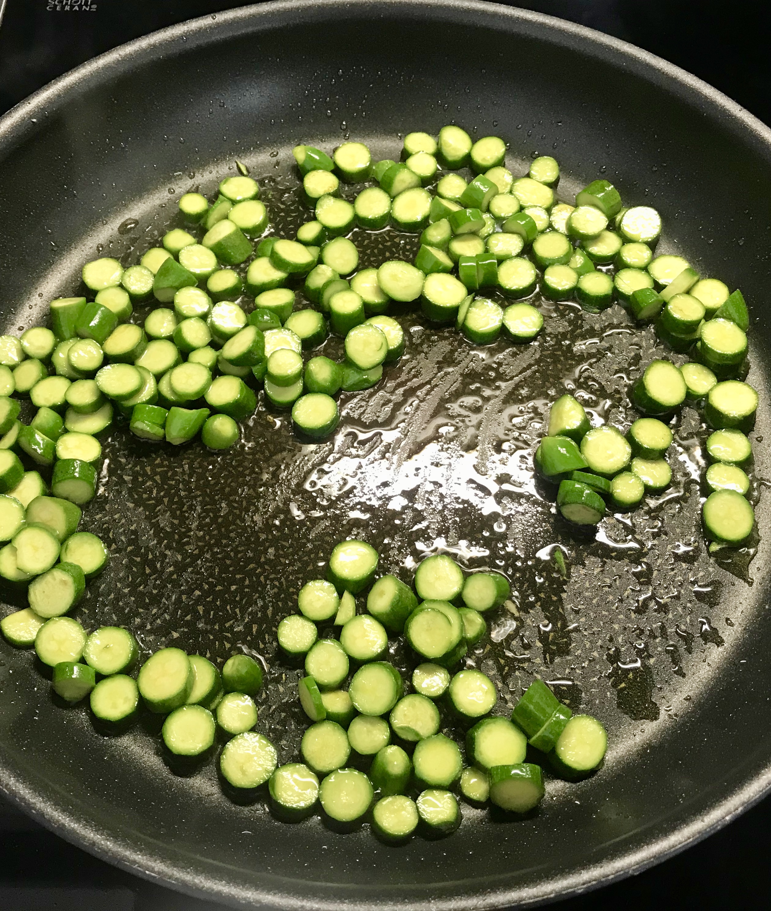 Silppua sipuli hienoksi ja kuullota noin neljässä ruokalusikallisessa oliiviöljyä. Lisää joukkoon hiukan vettä (lisäsin kahden hengen ja 18 kukan pastaan n. 1 dl) sekä suolaa ja pippuria sekä kesäkurpitsan kukat ja keitä noin 1-2 minuutin ajan. (Mikäli pastasi keittoaika on yli 5 minuuttia, pane se ensimmäisenä kiehumaan. Ota tällöin kastikkeeseen lisättävä vesi tärkkelyspitoisen pastan keitinveden joukosta.) Tarkista suola ja siirrä paistinpannu sivuun.