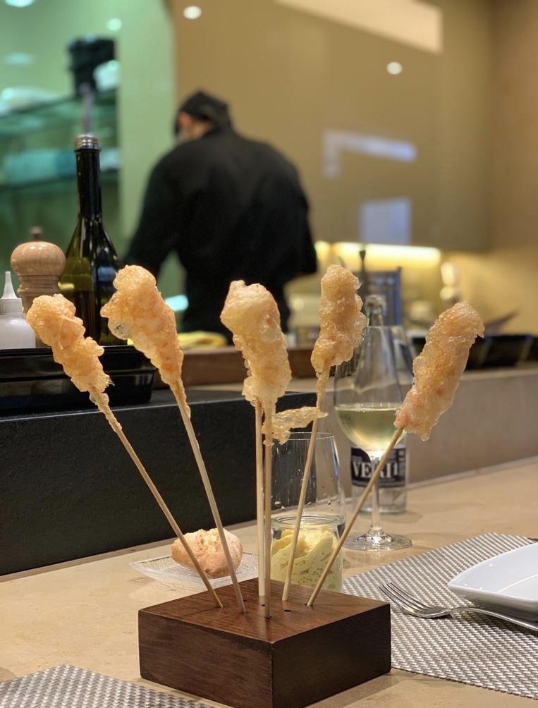 Onneksi ”sorruimme” Langustiinitempuroihin! Tempurat kun ovat paitsi herkullisia, yleensä erittäin raskasta ja rasvaista syötävää. Mutta nämä tempurat curry-dippikastikkeineen olivat kuin hattaroita, ilmavia ja kevyitä. Sain selville niiden keveyden salaisuudenkin: vehnäjauhojen sijaa oli käytetty riisijauhoja.