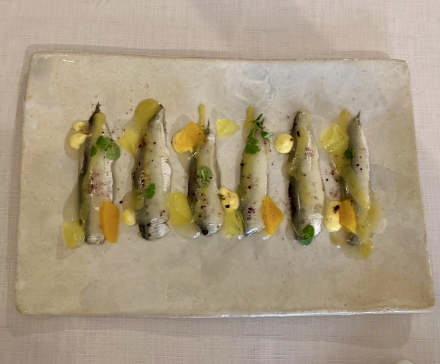 Tapas-valikoima oli sen verran erikoinen ja houkutteleva, että siitä olisi tehnyt mieli maistaa kaikkea. Tyydyimme neljään jaettuun tapas-annokseen ja kahteen jaettuun jälkiruokaan. Sitä ei muuten yhtään kummeksuta, ettei ota pääruokaa. Ylimmän kuvan Appelsiini-basilika marinoidut sardellit olivat yksi valintamme. Ne olivat täysin ruodottomia, keveitä ja kuin raikkaalla nektariinilla täytettyjä. Unelma!