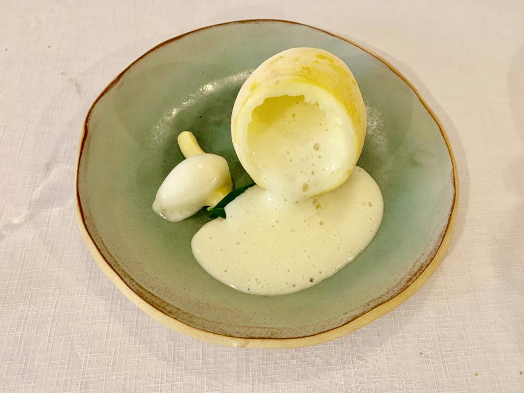 Toinen jälkiruoka oli nimetty niin niukasti, että se oli pakko valita: El limón del huerto, eli Hedelmätarhan sitruuna. Juuri tarjolle tuotaessa alkoi pakastetun sitruunankuoren avatusta päästä tulvia vaahtoa lautaselle. (Kuvassa vaahto on jo laskeutunut.) Sitruunankuoren perältä löytyi vaahtoa kiinteämpi kokonaisuus, joka maistui siltä kuin ranskalaisen marenkisitruunatortun torttupohja, täyte ja marenki olisi kaikki jauhettu sekaisin pehmeäksi, samettimaiseksi seokseksi. Herkullinen elämys!