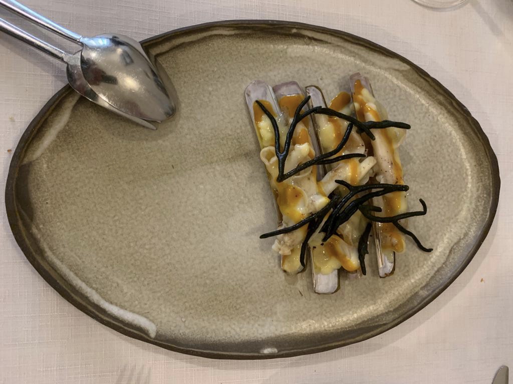 Toiseksi annokseksemme valitsimme Vermutti-simpukat, kolmanneksi Pintapaahdettua tonnikalaa porkkana-romanesco kastikkeen kera, molemmat kerrassaan herkullisia. Neljännen vaihtoehdon kohdalla päätimme ottaa riskin ja valita Partaveitsisimpukat escabèche-lime kastikkeella ja kodium-merilevällä. Saimme partaveitsisimpukoita ensimmäisen kerran muutama kuukausi sitten ranskalaisen ystävän tarjoamana. Sitä ennen emme olleet niitä nähneet tai niistä kuulleetkaan. Ne eivät olleet mikään ihmeellinen herkku ystävän tarjoamana yksinkertaisesti keitettynä eivätkä olleet nytkään. Mutta pitihän ne kokea paikassa, missä kaikki meren tarjonta osataan valmistaa hienostuneesti.