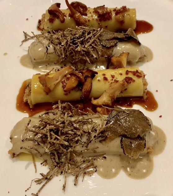 Els Tinars -ravintolalla on yksi tähti Michelin-oppaassa. Ravintola on parikymmentä kilometriä Geronan kaupungin ulkopuolella Llagosterassa. Ystävämme tunsivat sen entuudestaan ja valitsivat sen, koska ravintola sopii myös lasten kanssa ruokailuun. Menu sisältää sekä perinteisiä (ravintolaa hoitaa perhe kolmannessa polvessa) että innovatiivisia annoksia, joista valitsin kaksi alkuruokaa ja jälkiruoan. Palamósin gambakset runsas vuosi sitten olivat niin herkullinen kokemus, että niitä piti maistaa uudestaan, nyt vähän erilailla valmistettuna. Toinen alkuruokani oli Talon canellonit kanttarelli-tryffelikastikkeessa. Suussasulavaa.