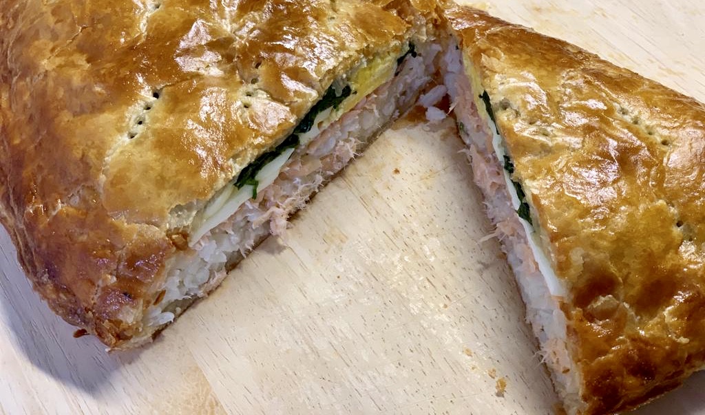 Kaulitse taikina noin 0,5 cm paksuiseksi suorakaiteeksi tai pyöreäksi kiekoksi, ellet käytä valmiiksi kaulittua taikinaa. Anna keitetyn riisin jäähtyä haaleaksi, ennen kuin levität riisin puolikkaalle pyöreästä kiekosta tai suorakaiteesta. Levitä baby-pinaatti riisin päälle (minulla unohtui pinaatti tässä vaiheessa, joten kuvassa se näkyy lohen päällä), sitten lohiviipaleet, viipaloidut kananmunat ja tilli. Nosta toinen puoli kanneksi ja nypytä piirakan reunat hyvin kiinni jauhotetuin sormin. Voitele kananmunalla ja paista 200 asteisessa uunissa noin puoli tuntia. Seuraa pinnan ruskistumista – minä peitin pinnan leivinpaperilla puolessa välissä paistoa.