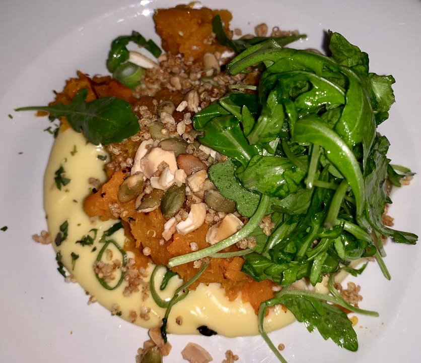 Mitä ihmettä BasBas sitten tarjoaa, kun se on niin suosittu? No, ei mitään ihmettä kuitenkaan, vaan mutkatonta, omintakeista, herkullista, runsaasti kasviksia sisältävää ruokaa. Liitutaululla on kolmeen osaan ryhmitelty suppeahko menu, josta valitaan 45 euron hintaan 2+1+1 annosta, niinkuin ravintola asian ilmaisee. Kaksi ensimmäistä ovat alkuruokia (valitsin kuvan myskikurpitsa-annoksen ja siika-carpaccion), kolmas annos on pieni pasta tai risotto ja neljäs ruokalaji on pieni annos esim. kalaa tai lihaa lisukkeineen. Pieneksi ilmoitetut annokset eivät ole kuitenkaan ihan pieniä, ja niistä tulee varsin kylläiseksi. Jos kaikki tämä ei riitä, voi sitten vielä tilata erikseen jälkiruoan.