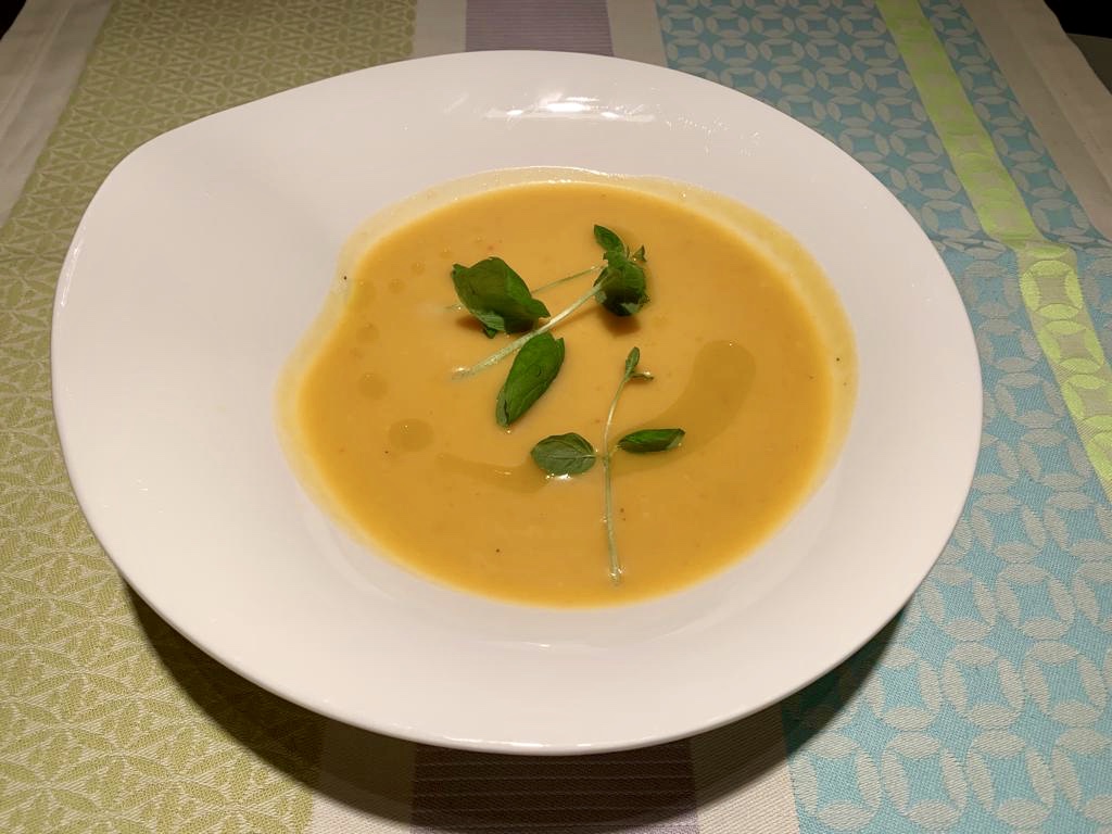 Myskikurpitsa on Hokkaidokurpitsaa makeampi ja minun makuuni keittoon liiankin makea, mutta raastetulla inkiväärillä terästettynä keitosta saa todella herkullista. Muita mausteita voi sitten lisätä omien mieltymystensä mukaan. Minä maustoin Espelette-chilipippurilla ja kanelilla. Yrtiksi kokeilin vaihteeksi minttua, joka antoikin keitolle ihan uuden tuulahduksen. Kerma ei ole olleenkaan välttämätöntä, eikä sen määrää kannata liioitella.