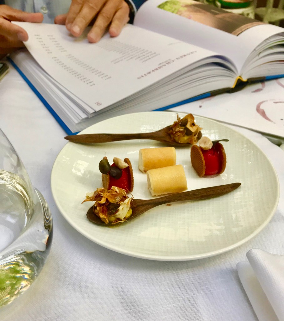 Kuvassa alkupalat, joista yksi oli retiisi-, yksi juusto-pohjainen ja yksi kapris-artisokka-moussea. Ei mitään perusalkupaloja siis… Ravintolan viinilista (eli -kirja) ja koko ravintola on omistettu Bourgognen viineille. Ravintolan nimikin Les Climats viittaa Bourgognessa yksittäisistä viinipalstoista, climat, käytettyyn sanaan. Viinipalstojen luokitus on Bourgognessa maailman tarkin, mutta yhdellä viinipalstalla, eli climat’lla voi kuitenkin olla useita viinin viljelijöitä.