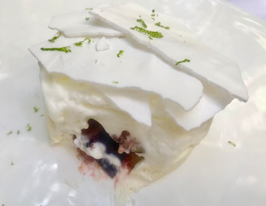 Sain elämäni ehkä parhaan jälkiruoan, tuoretta basilikassa marinoitua viikunaa, marenkia, vaniljajogurttia ja lime-sorbettia.