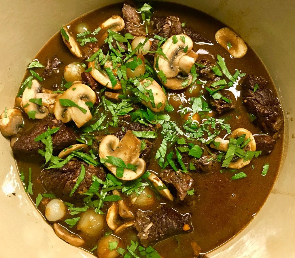 Kun liha on mureaa, kaada padan sisältö kattilan päälle asetettuun siivilään. Huuhdo pata hyvin ja nostele liha ja pekoni pataan takaisin. Levitä kypsät sipulit ja herkkusienet lihan päälle. Kuori kastikkeesta pois rasva. Keitä kastiketta hiljaa 1 – 2 minuuttia kuorien rasvaa, kun sitä nousee pinnalle. Nyt pitäisi olla jäljellä n. 5 dl kastiketta, joka on kyllin sakeaa juuttuakseen ohuelti lusikkaan. Jos se on liian ohutta, keitä sitä kiivaasti vähemmäksi. Jos se on liian sakeaa, sekoita siihen muutama ruokalusikallinen lihalienta. Tarkista maku huolellisesti ja kaada kastike lihan ja kasvisten päälle.