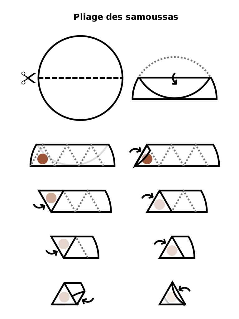 Fillo-taikinalevyt voivat olla pyöreitä tai suorakaiteen muotoisia. Täällä Ranskassa saatavilla olevat ovat useimmiten pyöreitä, 30 cm halkaisijaltaan. Niistä saa juuri sopivan kokoisia samoussoja, kun leikkaa pyöreän levyn ensin kahtia ja taittaa sitten puolikuun muotoiset levyt kahtia, nostamalla pyöreän reunan pitkää, suoraa reunaa vasten. Tuloksena on kaksi noin 9 cm leveää kaistaletta. Nosta lusikalla täytettä kaistaleen toiseen päähän ja taittele kolmion muotoon. Viimeinen kaistaleen osa työnnetään kolmion sisään.