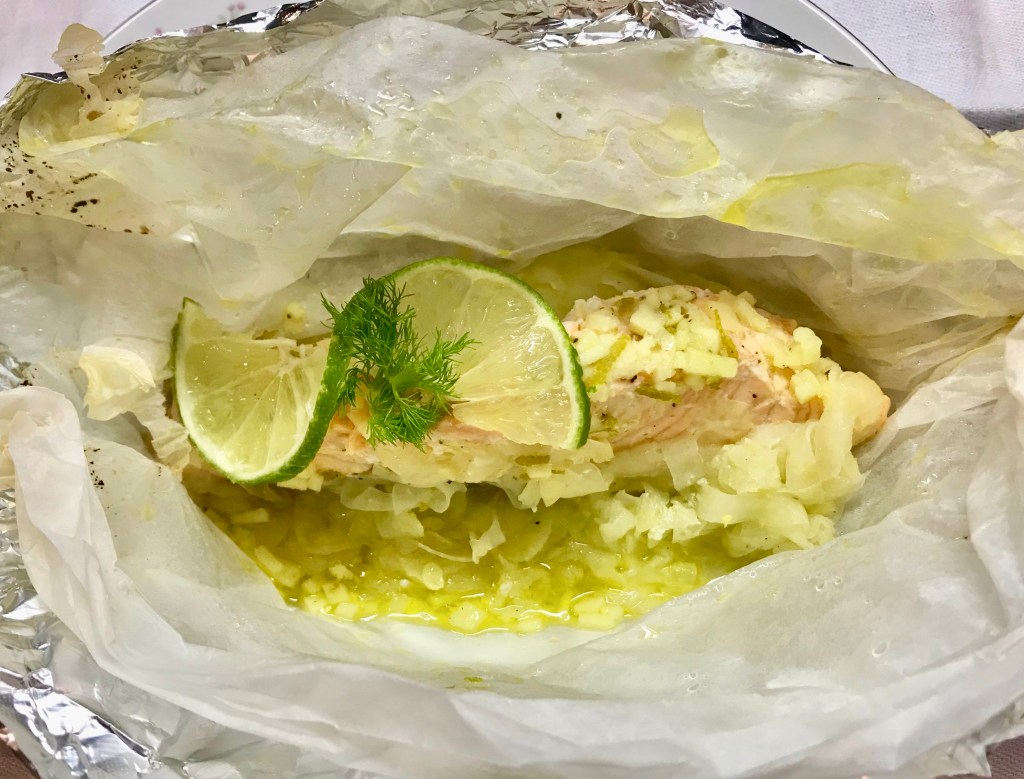 Kuullota fenkoliviipaleita öljyssä parin minuutin ajan. Alkuperäisessä ohjeessa käytetään vain yksi fenkoli ja viipaleet pannaan nyyttiin raakoina. Minä pidän siitä, että fenkolia on enemmän ja kuullotan sitä hiukan, jotta se painuu vähän kasaan ja vaatii nyytissä vähemmän pinta-alaa. Leikkaa foliosta ja leivinpaperista neljä suorakaiteen muotoista palaa. Pane leivinpaperipalat foliopalojen päälle ja jaa sitten kuullotetut fenkolirenkaat keskelle leivinpapereita lohipalan muotoa noudattaen. Nosta päälle lohipalat ja valele ne öljy-lime-inkivääri-seoksella. Sulje nyytti niinkuin käärisit ison karemellin paperiin. Jos sinulla on raffia-niintä, kostuta sitä ja sulje ”karamellipaperin” päät rusetilla. Minä suljin päät yksinkertaisesti kiertämällä paperia.