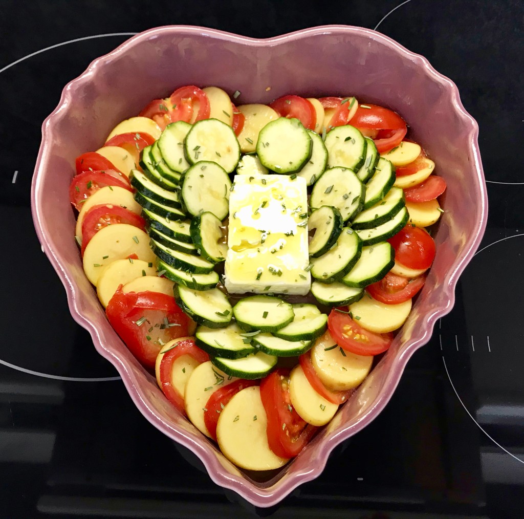 Viipaloi perunat ja kesäkurpitsat noin 3 mm viipaleiksi ja tomaatit hiukan paksummiksi. Lorauta vuoan pohjalle öljyä ja pyörittele peruna- ja kesäkurpitsaviipaleet öljyssä. Lado peruna- ja tomaattiviipaleet keskenään limittäin ja kesäkurpitsat omiin jonoihinsa. Jätä keskelle tilaa fetajuustolle, jonka nostat siihen kun olet järjestänyt tomaatit, perunat ja kesäkurpitsat. Liruta fetan päälle oliiviöljyä, kasvisten päälle ei enää tarvita, koska paistosta ei tarjoilla pastan kanssa, vaan sellaisenaan tai lisukkeena. Mausta mustapippurilla ja pilko päälle tuoretta rosmariinia. Paista 200 asteisessa uunissa 45 minuuttia.