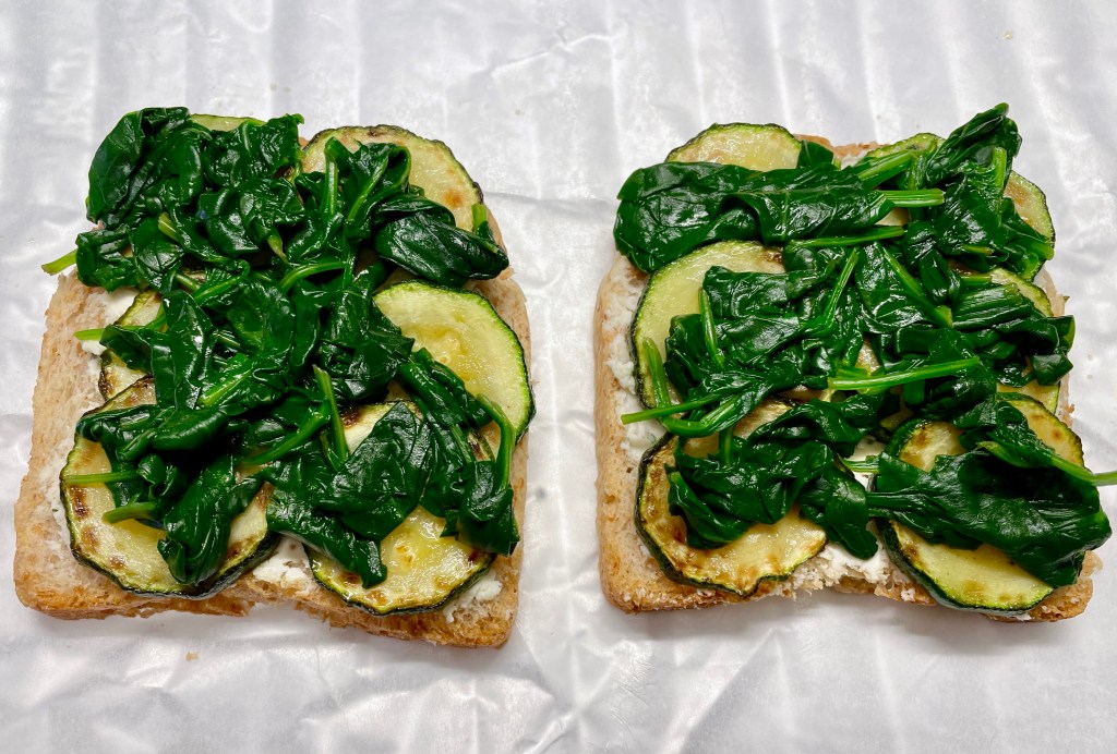 Voitele kaksi paahtoleipäviipaletta tuorejuustolla (alkuperäisessä ohjeessa 40 g per viipale, minä käytin ensimmäisellä kerralla 30 g ja toisella kerralla 15 g, mikä mielestäni riittää hyvin) ja siirrä viipaleet leivinpaperilla suojatulle uuniritilälle. Asettele kummankin viipaleen päälle kesäkurpitsaviipaleet ja levitä niiden päälle baby-pinaatti.