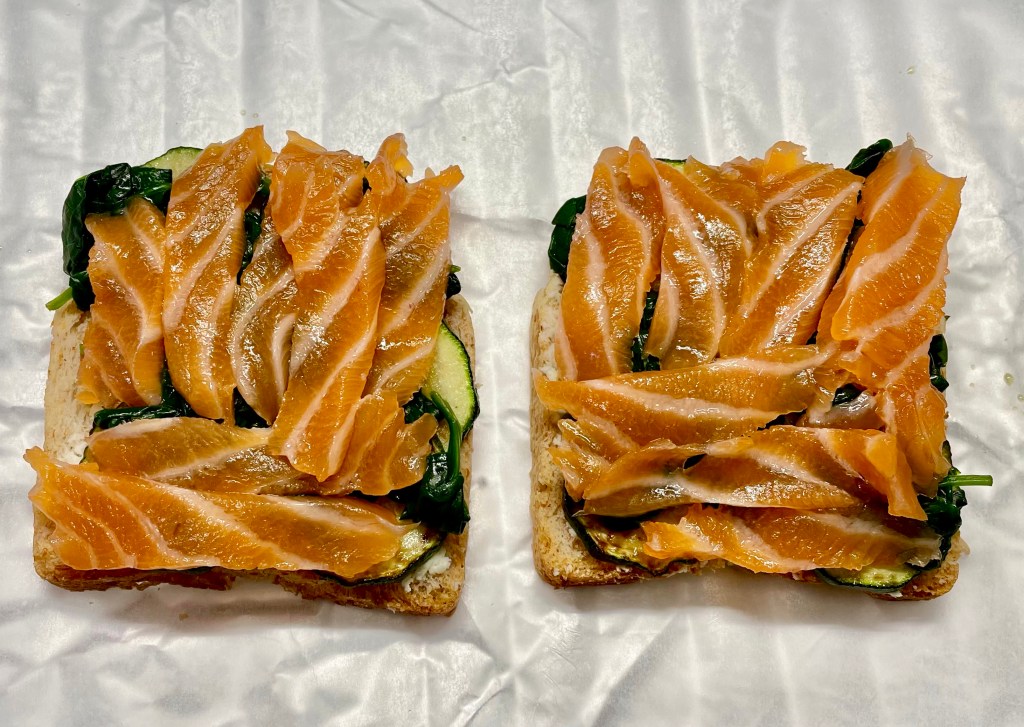Paahda ensin leipäviipaleet paahtimessa tai ja täytä ne sen jälkeen ohjeen mukaisesti. Voita ei tässä enää tarvita. Leipien sisällä oleva lohi jää kylmäksi ja ”raa’ aksi”, mutta kaikki muut ainekset ovat lämpimiä. Kokonaisuus on jotenkin ylellisempi, kuin uunissa valmistetussa vaihtoehdossa.