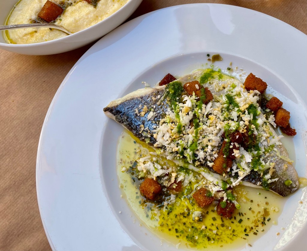 Fine gueule -ravintolalla on valkoisine pöytäliinoineen viehättävä lasitettu pikkuterassi, missä nautimme lähtöpäivän lounaan. Ruoka edustaa perinteistä ranskalaista keittiötä, mihin nytkin kuului paljon kermaa ja voita. Niinkuin kuvasta voi todeta dorade-annoksen kastike on varsin voinen, ja kermaisessa polenta-lisukkeessa on kerma ja voi ihan silmin nähtävissä. No, hyväähän se oli, mutta ei tällaista usein voi nauttia. (fine guele = herkkusuu)