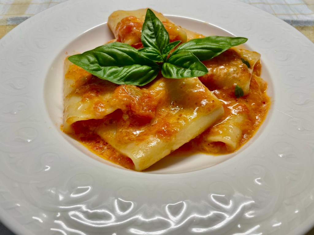 Kahdeksanhenkinen perheemme ihastui kolmessa polvessa tähän pastaan siinä määrin, että jokaisen tuliaiskassista löytyi paketti jättikokoista paccheri-pastaa. Tomaattikastikkeinen Paccheri allo Scarpariello on ikivanha, yksinkertainen Napolin alueen kansanruoka. Sen salaisuus on ensiluokkaisissa aineksissa. Tutkin netistä useita reseptejä ja videoita, ja ainesten laadun tärkeyttä korostetaan – pastan pitää mielellään olla Napolin alueen kuuluisaa Gragnano-pastaa (useita merkkejä) ja tomaattien pieniä Piennolo-tomaatteja. No, ilmankin saadaan herkullinen lopputulos.