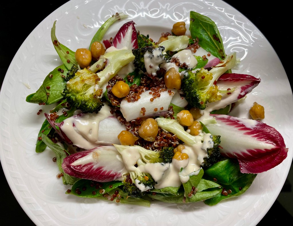 Sekoita kulhossa keskenään vuonankaalin tai salaatin lehdet, parsakaali, kvinoa sekä puolet kick-herneistä sekä punasikurin lehdistä. Pirskottele päälle hieman oliiviöljyä. Jaa salaatti lautasille ja koristele ne lopuilla kick-herneillä ja punasikurin lehdillä. Ripottele päälle tahini-situunakastiketta.