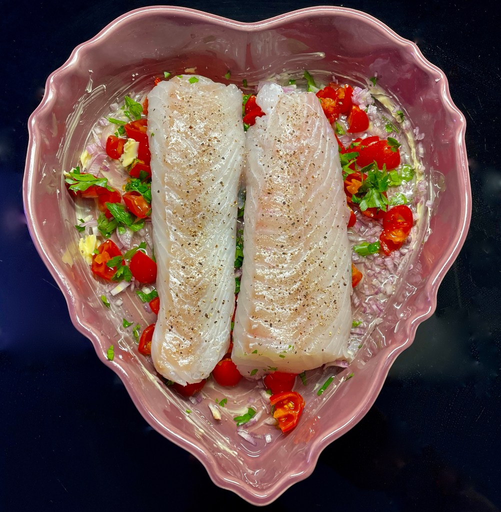 Voitele uunivuoka ronskisti voilla. Kalttaa tomaatit ja poista niistä siemenet (minä käytin pikkutomaatteja, jotka vain halkaisin ja joista puristin kevyesti siemenet ja osan mehusta). Pane voidellun vuoan pohjalle silputut sipulit, pieniksi paloiksi pilkotut tomaatit ja persiljasilppu. Asettele päälle kalafileet ja kaada viini joukkoon. Suolaa ja pippuroi kala (ei liikaa, sillä ainesten omat aromit riittävät antamaan kastikkeelle vahvan ja sille ominaisen maun).