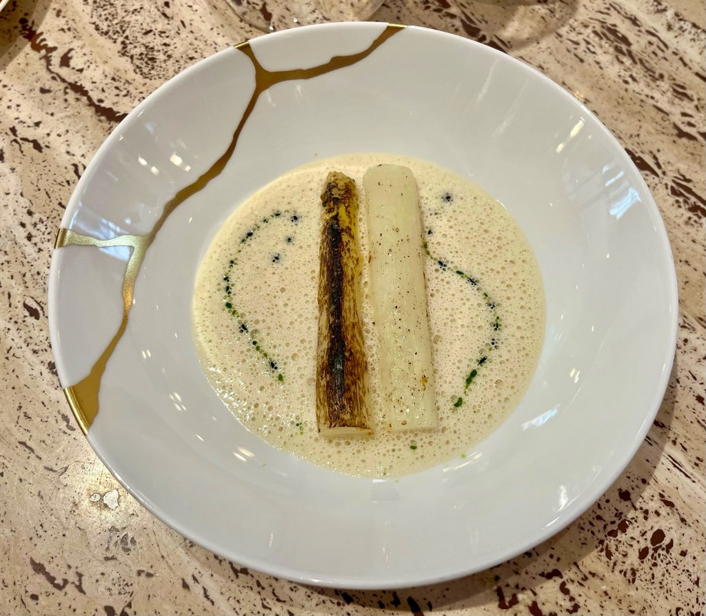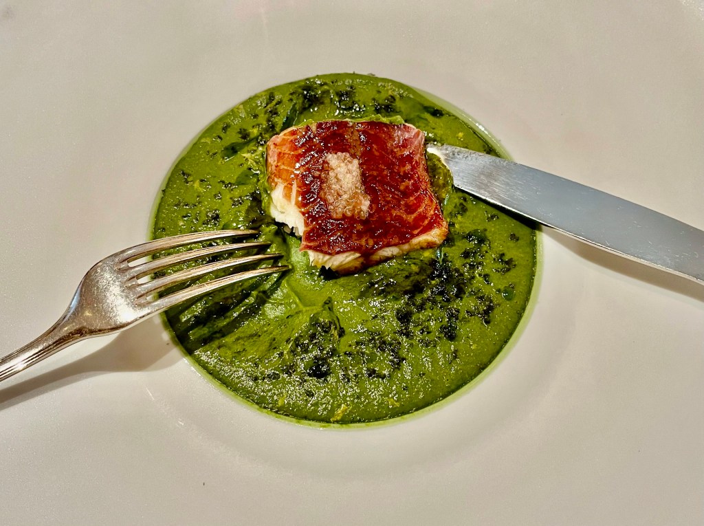 Menestys on ilmeisesti vaikuttanut myös menuiden hintoihin, jotka ovat ehtineet jo nousta ravintolan avaamisen jälkeen. Täällä ei edullista arkilounasta ole tarjolla. Menu koostuu erittäin moderneista, hienostuneista ja esteettisistä annoksista. Valittavana on kolmen, neljän tai seitsemän ruokalajin menu. Menu oli niin mielenkiintoinen, että tavoistamme poiketen valitsimme kolmen ruokalajin (75 euroa) sijasta neljä (95 euroa). Hyvä niin, koska annokset olivat todella pieniä, mutta kokemisen arvoisia! Valikoimaamme kuului mm. super-herkullinen L’anguille au Vert, laquée à la bière (ankeriasta vihreässä kastikkeessa), johon Gabsi on kuulema saanut inspiraation perinteisestä belgialaisesta ruokalajista. Tällä annoksella oli kyllä varmasti aika vähän tekemistä perinteisen annoksen kanssa.
