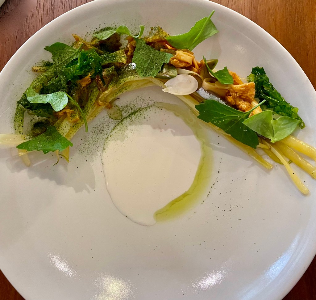 Suosikkini oli alkuruokana tarjoiltu annos, missä oli pitkiä, lähes valkoisia papuja, kanttarelleja, savustettua sardellia, mantelia, yrttisalaattia ja mantelimaitoa.