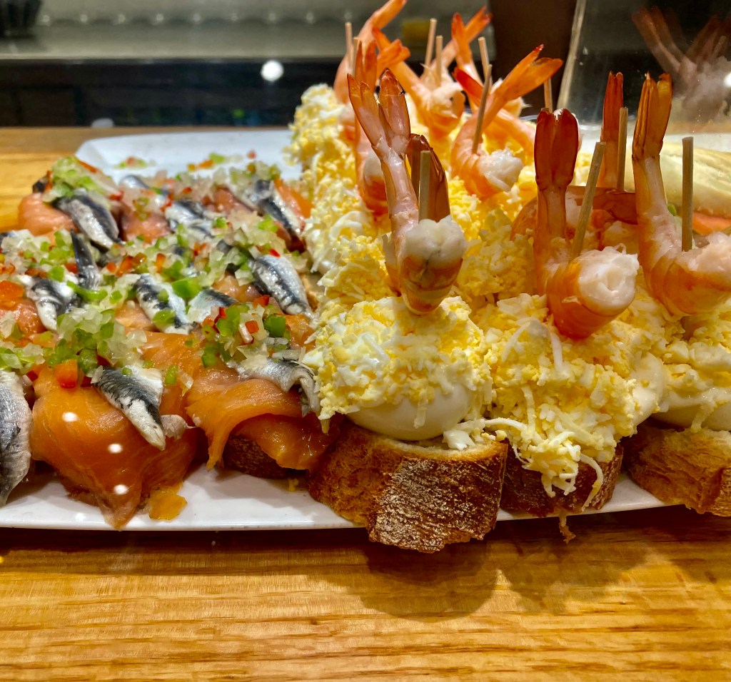 Pintxos on siis baskialueen vastine espanjalaisille tapaksille, eli juomien kanssa nautittaville pikkupaloille. Wikipedian mukaan pintxos-nimen alkuperä on sanassa pintchar, joka tarkoittaa pistämistä tai kiinnittämästä, sillä nämä pikkupalat on usein kiinnitetty pieneen leipäalustaan puisella ”hammastikulla”.
