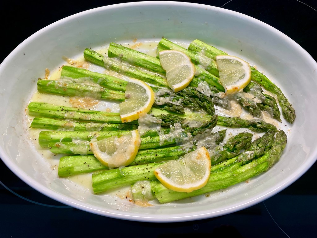 Pyörittele parsat oliiviöljyssä, asettele ne uunivuokaan. Ripottele päälle pippuria ja hiukan suolaa. Pese biositruuna ja leikkaa siitä muutama viipale parsojen päälle. Viipaleita ei tarvita montaa – mehu leviää viipaleista kaikkialle. Vuole esim. juustohöylällä päälle parmesanlastuja.