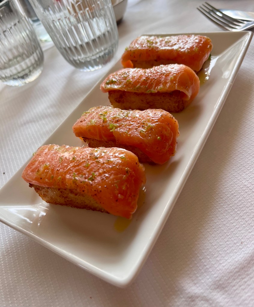 Kun tarjoilija kuvaili ”crispy saumon sushi” -annokseen sisältyvän paistettua riisiä, totesin mielessäni, ettei ole minun juttuni. Mutta kun seurueemme nuorin sai annoksen eteensä, oli pakko tilata toinen annos koko seurueen maisteltavaksi. Citrus-jalapeno maustettu lohi oli nimittäin rapeaksi paistetun, suorakulmion mallisen riisin päällä. Uutta ja ihanaa!