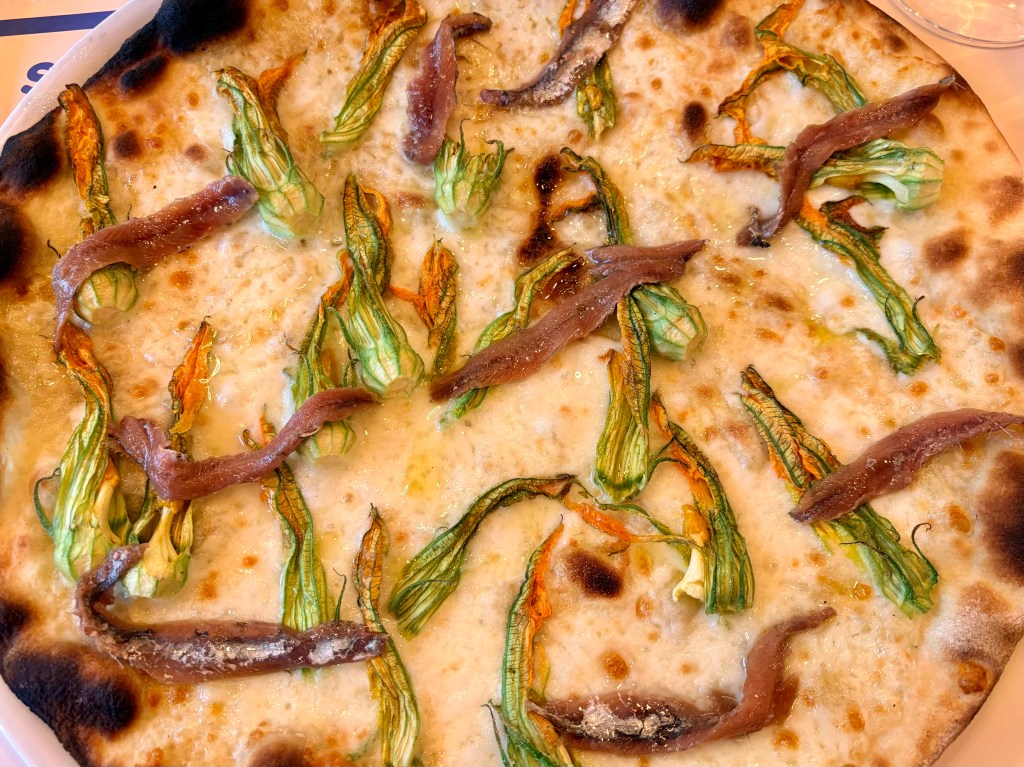 Seuraavana päivänä päätimme syödä pizzaa. Vaikka olemmekin napolilaisen pizzan ehdottomia kannattajia, halusimme tällä kertaa antaa roomalaiselle pizzalle uuden mahdollisuuden. Roomalainen pizza on hyvin ohut, kevyt ja rapea. Sen reunat ovat litteät ja pizza on myös vähärasvaisempi kuin napolilainen pizza, joka on pulleareunainen, runsastäytteisempi, pohja pehmeä ja hiukan ”venyvän kumimainen”. Italialaisten ystävien suosituksesta maistelun paikaksi valittiin Trasteveressä sijaitseva Pizzeria l’Elementare. Pizzoja odotellessa maistelimme suppli-palleroita, tyypillistä roomalaista alkupala- ja katuruokaa. Täällä täytteet olivat mielikuvituksellisia ja herkullisia! Pizzaksi minä valitsin kesäkurpitsa-sardellipizzan (kuva yllä), joka oli todella aivan ihana!