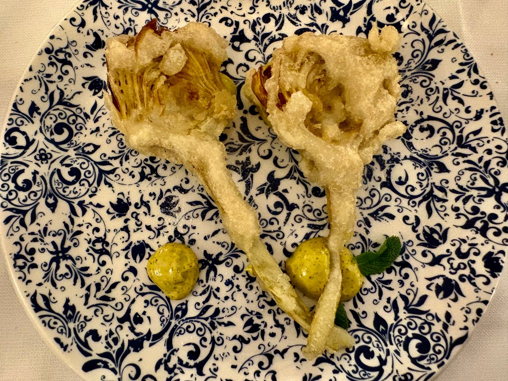 Toinen Michelin-oppaan valintamme, lähtöpäivämme Osteria Poldo e Gianna kruunasi koko matkan. Ruokalista on traditionaalinen, mutta annoksissa on hipaus hienostuneisuutta, ja annosten hinta on hyvin kohtuullinen. Alla oleva artisokkatempura oli todella herkullinen, niinkuin kaikki kolmen hengen seurueemme annokset.
